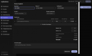 ... ist die All-in-One Business-App für Selbständige und kleine Unternehmen. Angebote erstellen, Rechnungen verwalten, Kunden pflegen, Wartungsverträge tracken, Tätigkeiten und Stunden erfassen und Zahlungseingänge verbuchen – alles in einer Lösung. Die Web-App ist bereits verfügbar, eine vollständig offline-fähige .NET MAUI App folgt in Kürze.